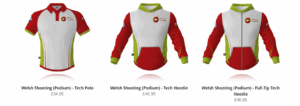 Mae gan Saethu Cymru ystod o ddillad hyfforddi a hamdden pwrpasol ar gyfer athletwyr, hyfforddwyr a chefnogwyr Cymru. Byddem yn annog yn gryf i bob athletwr a ddewisir i gynrychioli Cymru brynu ein hamrywiaeth Tech ddynodedig o ddillad cystadlu.