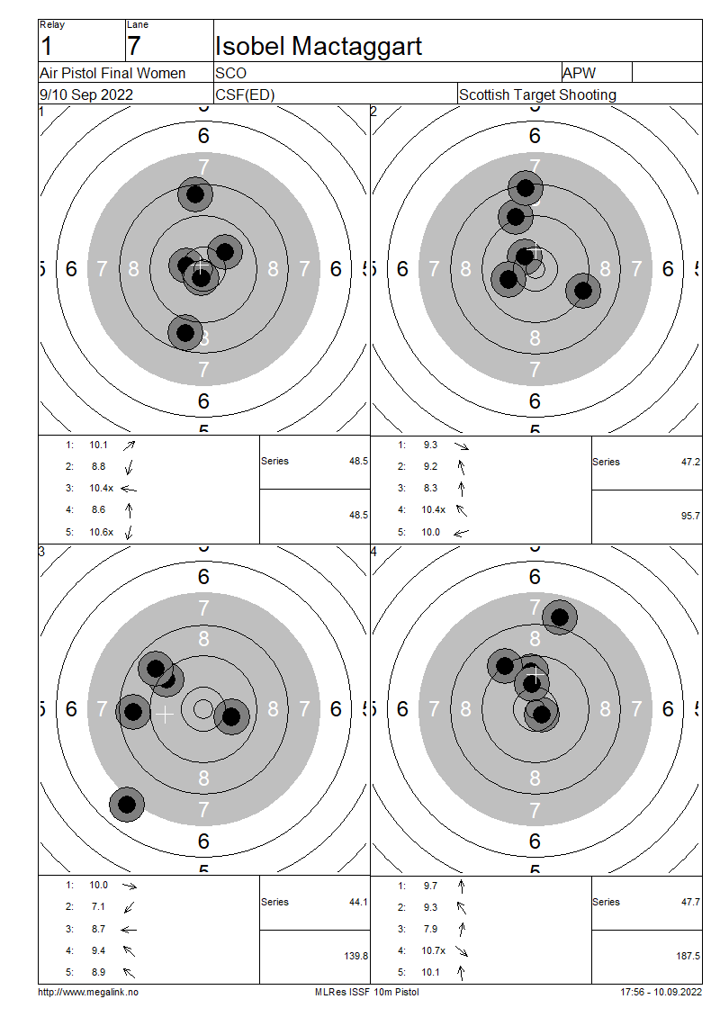 | 5 | G | 209 | MACTAGGART Isobel | SCO | 48.5 | 47.2 | 44.1 | 47.7 | 187.5 | ||||||||||||||||||||||||||||||||||||||||