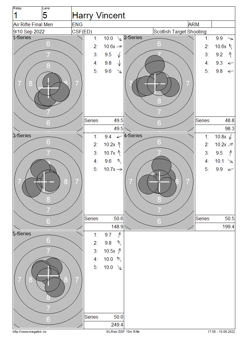 | 4 | E | 164 | VINCENT Harry | ENG | 49.5 | 48.8 | 50.6 | 50.5 | 50.0 | 249.4 | |||||||||||||||||||||||||||||||||||||||