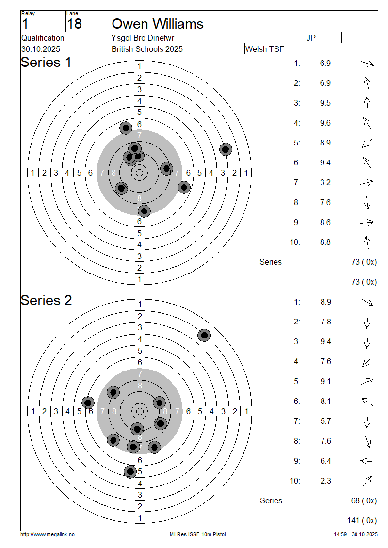 | 18 | 17 | WILLIAMS Owen | Ysgol Bro Dinefwr | JP | 73 | 68 | 141- 0x | ||||||||||||||||||||||||||||||||||||||||||