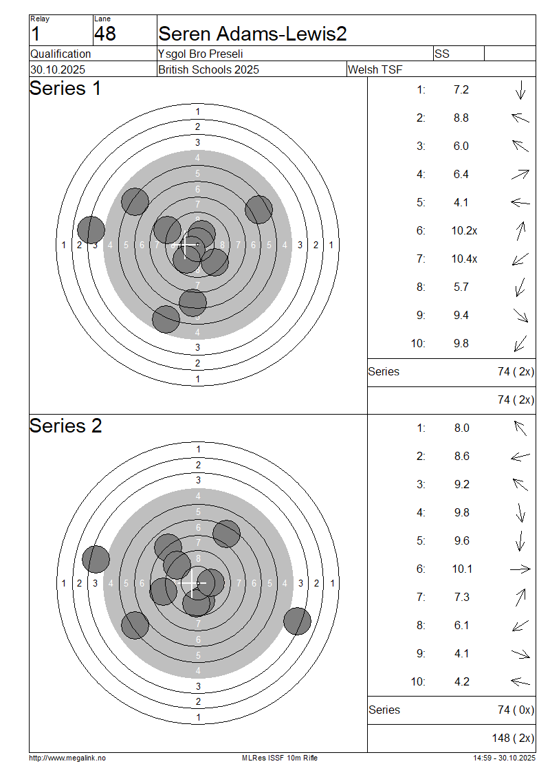 | 48 | 39 | ADAMS-LEWIS2 Seren | Ysgol Bro Preseli | SS | 74 | 74 | 148- 2x | QF | |||||||||||||||||||||||||||||||||||||||||