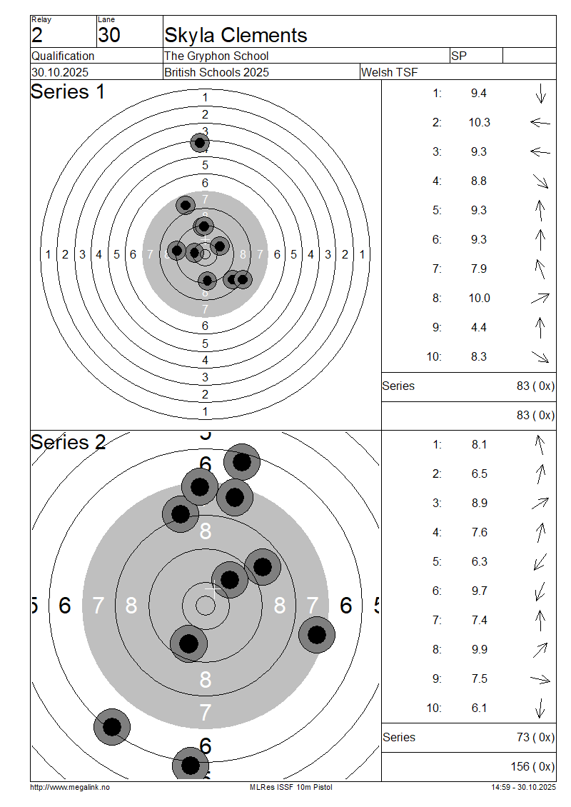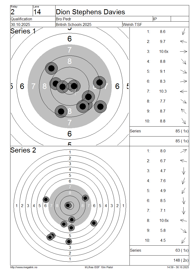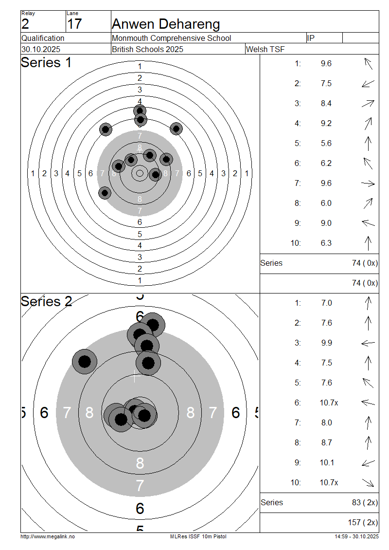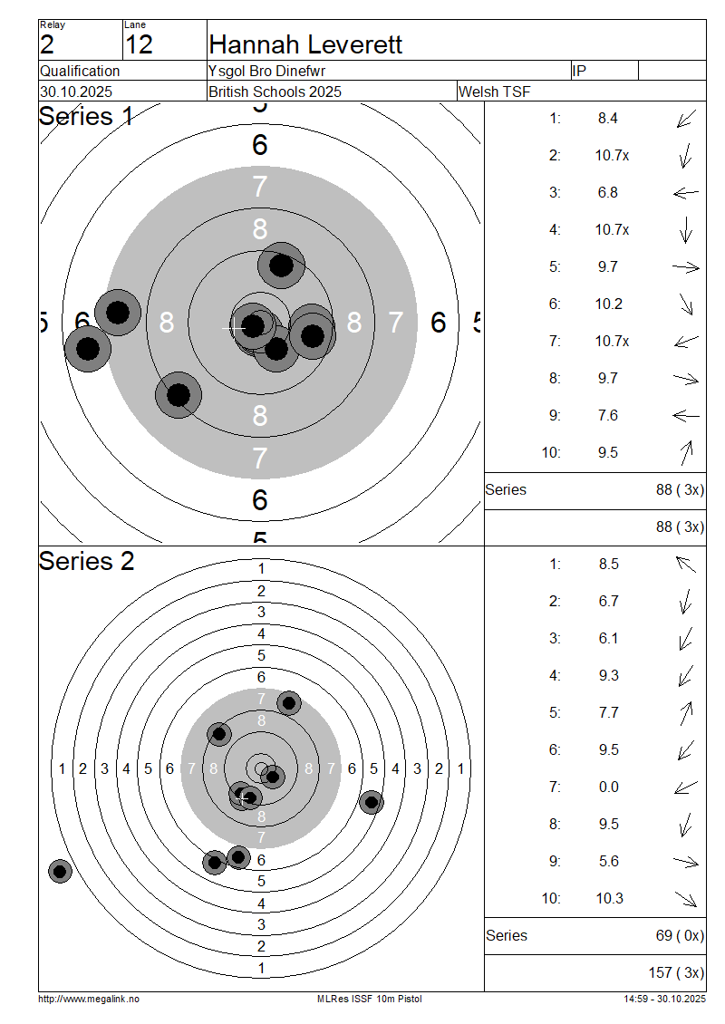 | 12 | 28 | LEVERETT Hannah | Ysgol Bro Dinefwr | IP | 88 | 69 | 157- 3x | QF | |||||||||||||||||||||||||||||||||||||||||