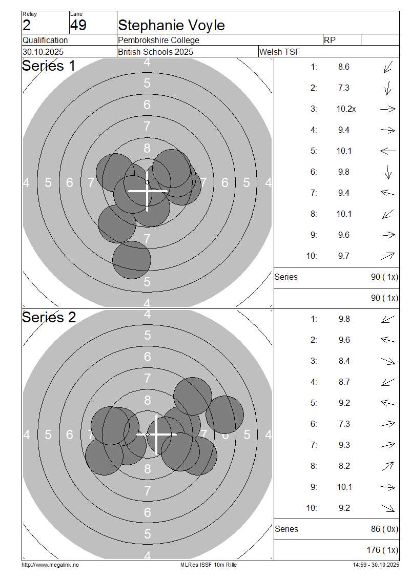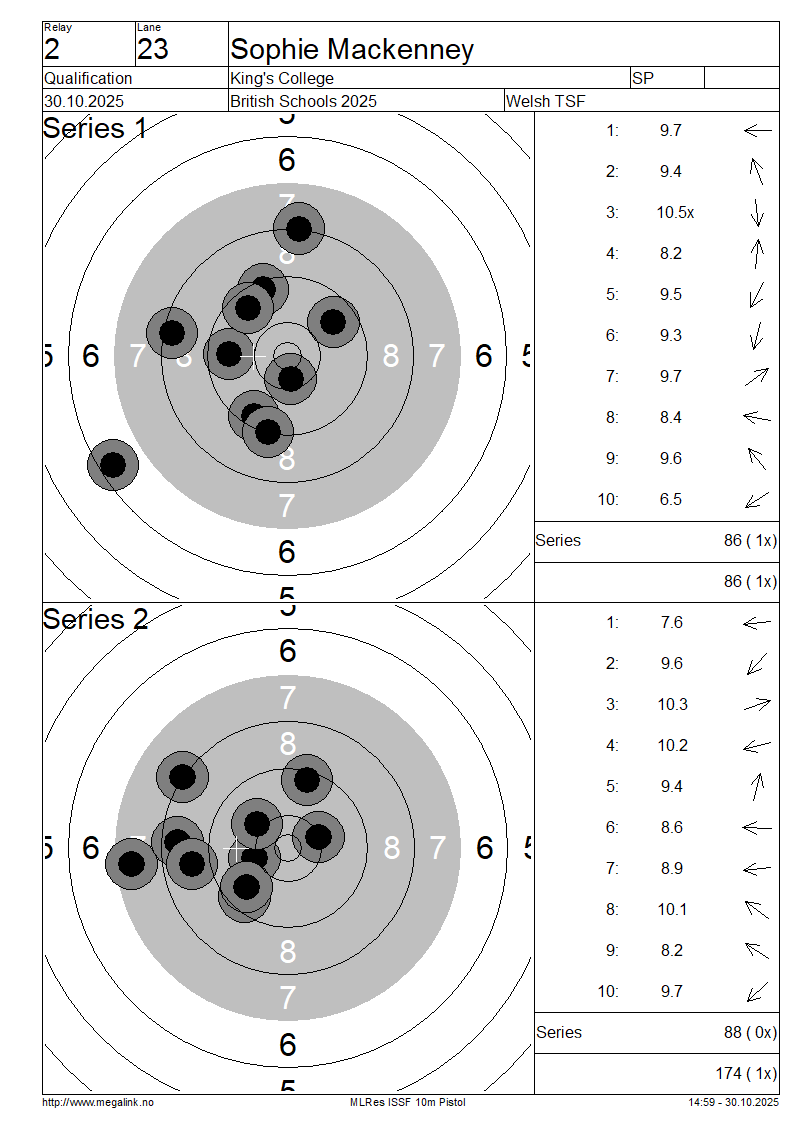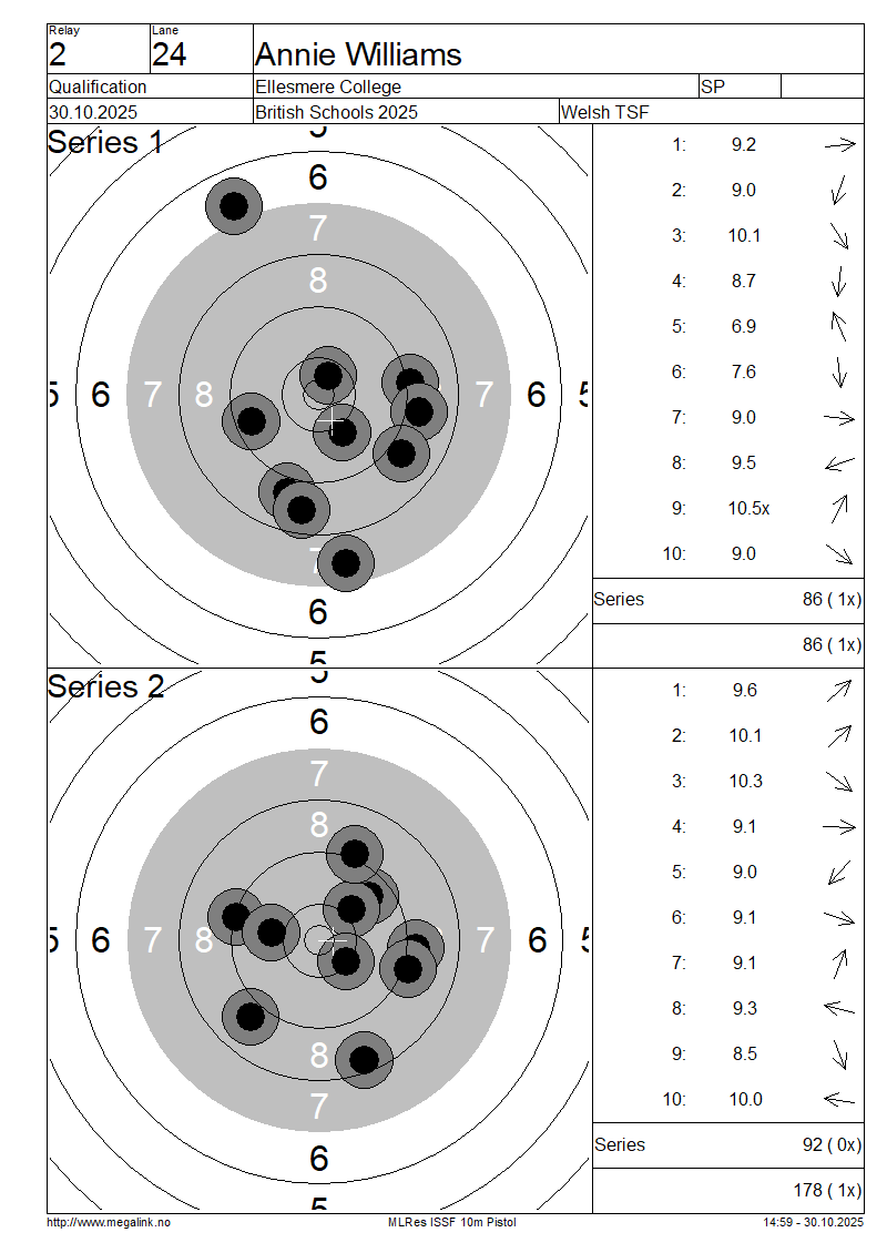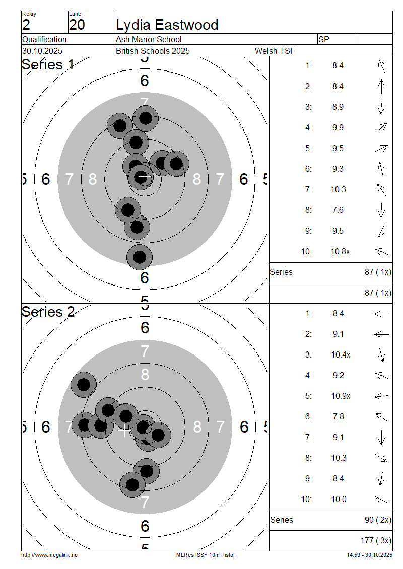 | 20 | 57 | EASTWOOD Lydia | Ash Manor School | SP | 87 | 90 | 177- 3x | QF | |||||||||||||||||||||||||||||||||||||||||