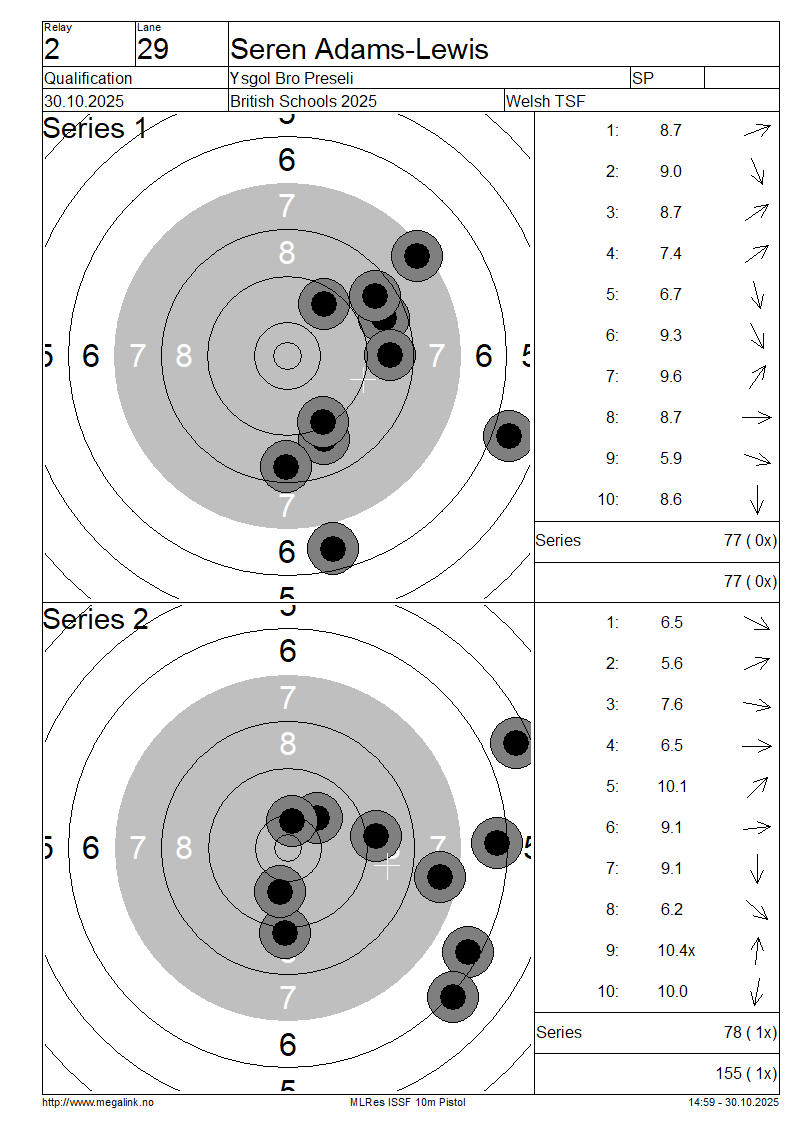 | 29 | 66 | ADAMS-LEWIS Seren | Ysgol Bro Preseli | SP | 77 | 78 | 155- 1x | ||||||||||||||||||||||||||||||||||||||||||