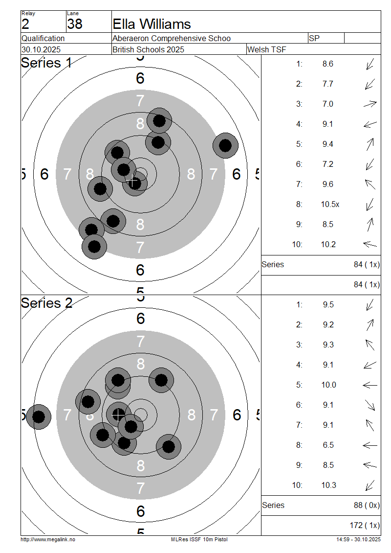 | 38 | 72 | WILLIAMS Ella | Aberaeron Comprehensive Schoo | SP | 84 | 88 | 172- 1x | QF | |||||||||||||||||||||||||||||||||||||||||