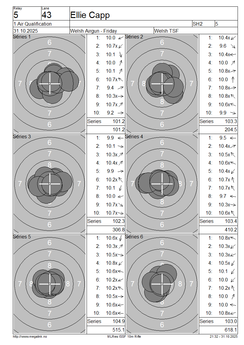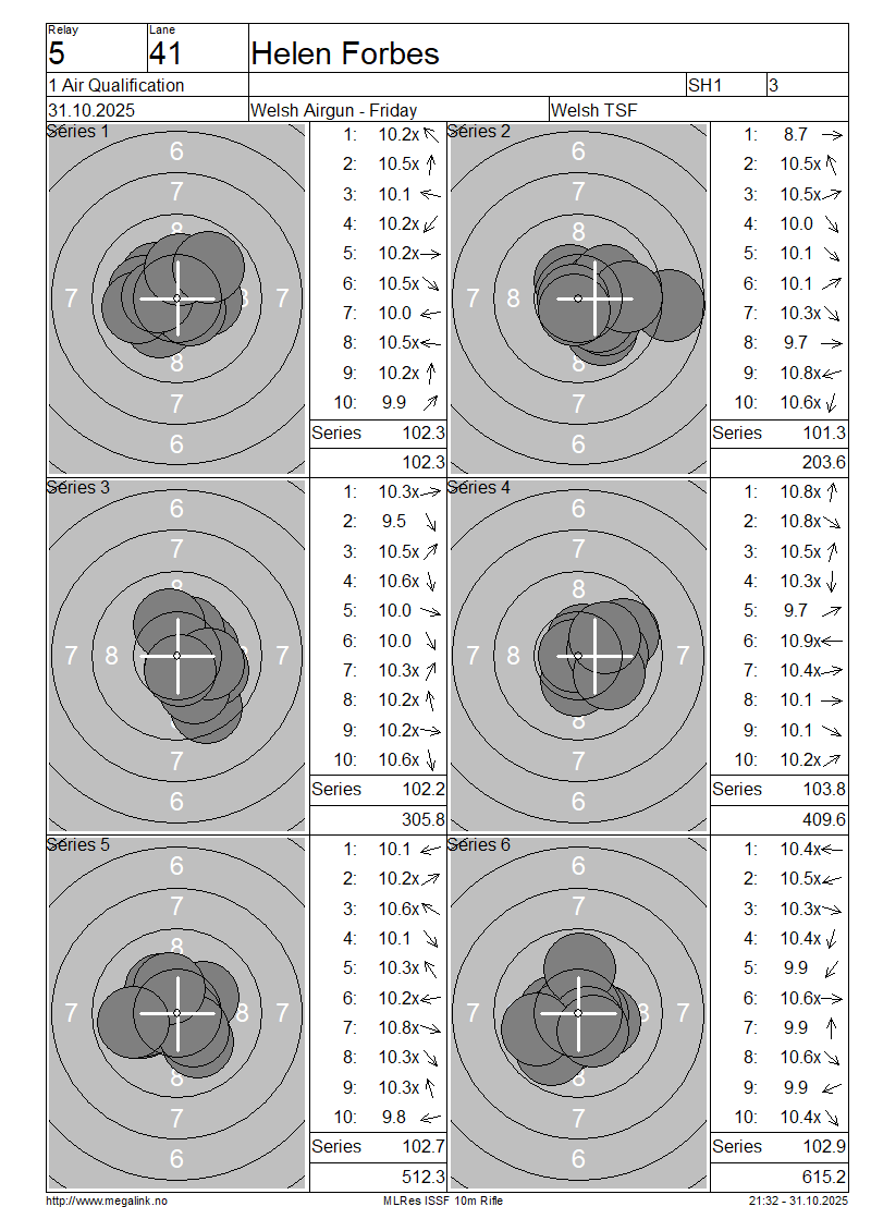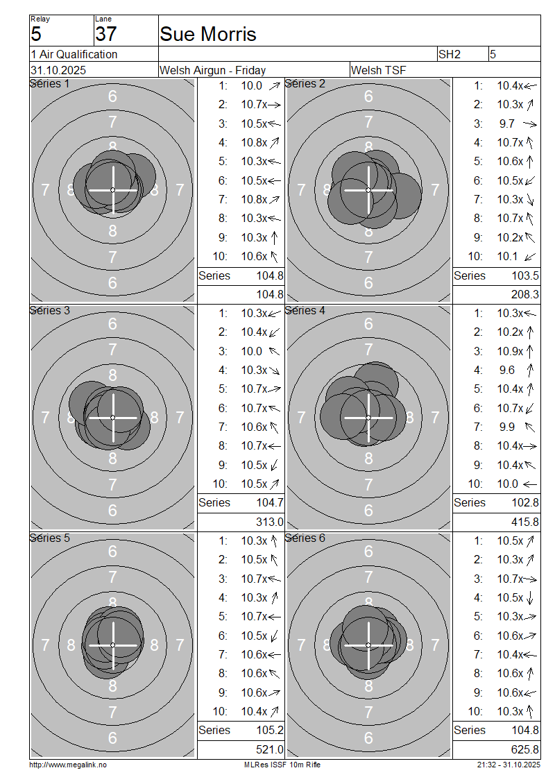 | 37 | 901 | MORRIS Sue | SH2 | 104.8 | 103.5 | 104.7 | 102.8 | 105.2 | 104.8 | 625.8 | |||||||||||||||||||||||||||||||||||||||