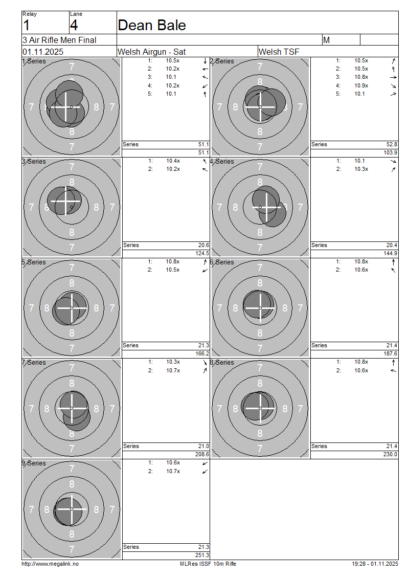 | D | 509 | BALE Dean | 51.1 | 52.8 | 20.6 | 20.4 | 21.3 | 21.4 | 21.0 | 21.4 | 21.3 | 251.3 | SO | ||||||||||||||||||||||||||||||||||||
