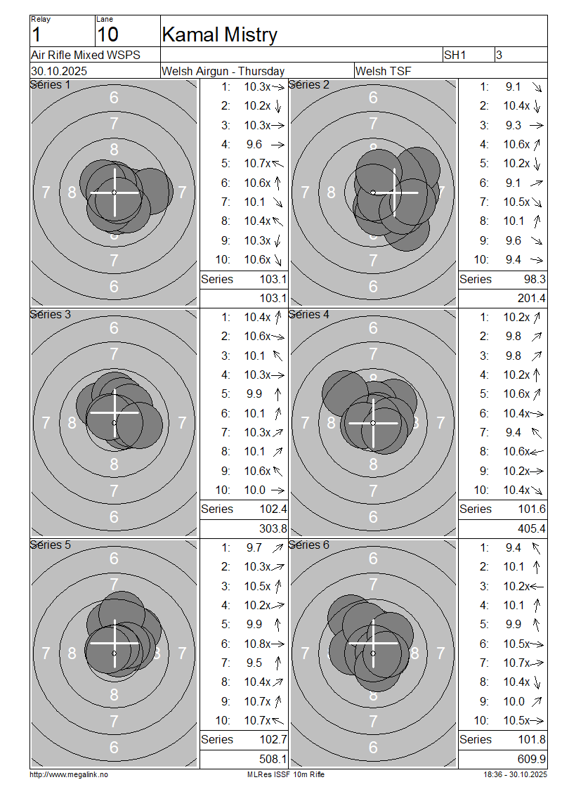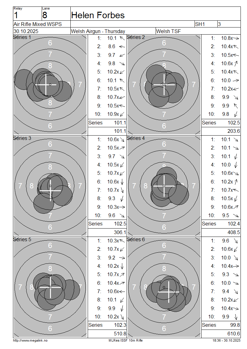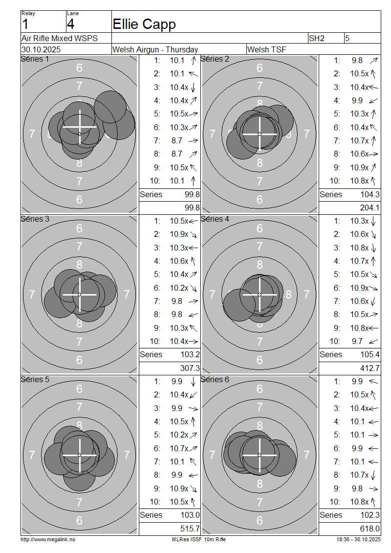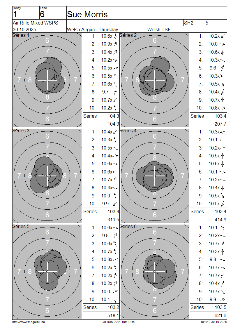 | 6 | 901 | MORRIS Sue | SH2 | 104.3 | 103.4 | 103.8 | 103.4 | 103.2 | 103.5 | 621.6 | |||||||||||||||||||||||||||||||||||||||